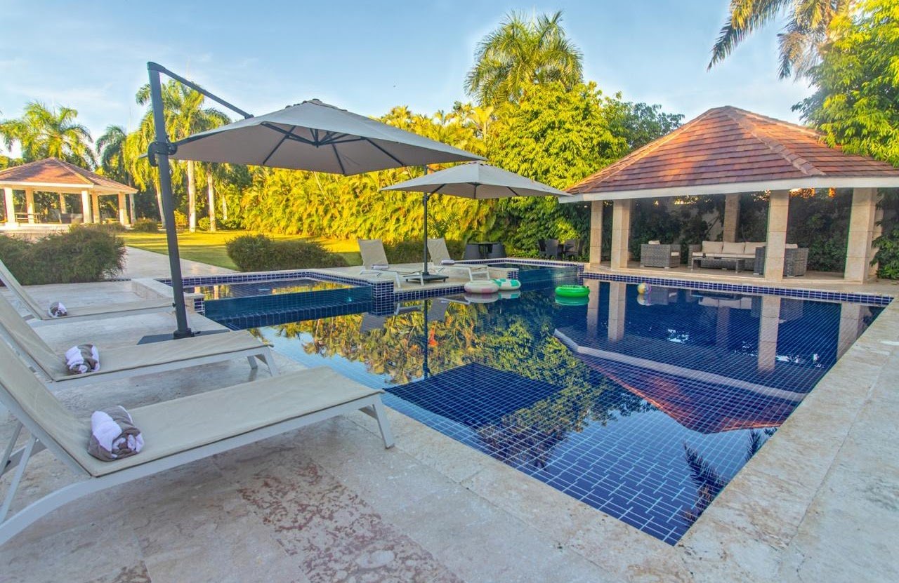 Has a pool and two Jacuzzis. With lots of lounge chairs and a gazebo and covered area with fans to hang out by the pool.
