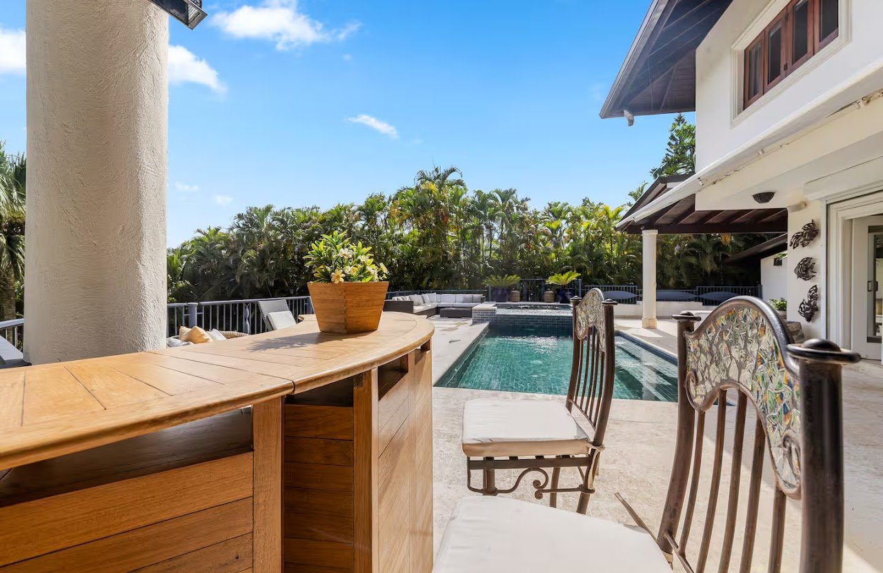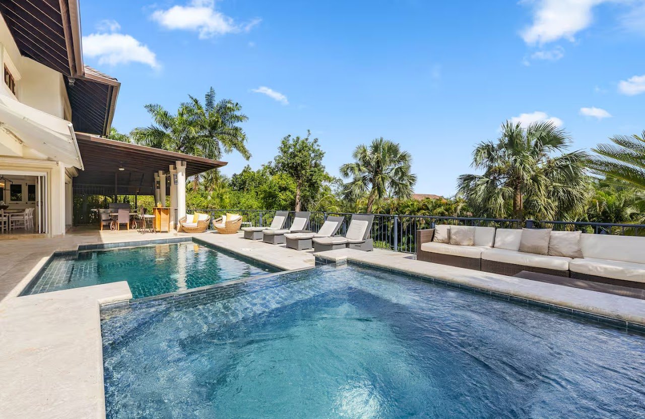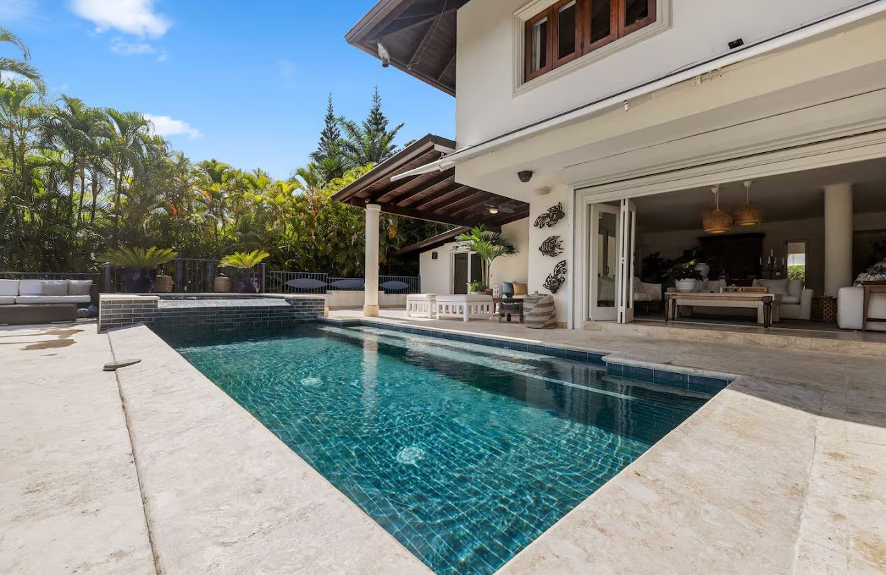 This villa features a pool and jacuzzi on the back deck overlooking the trees behind the house.